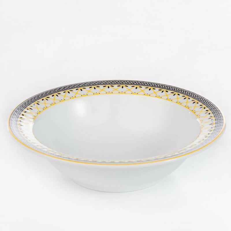 Салатник выполнен из высококачественного фарфора и дополнен геометричной окантовкой, придающей дизайну особую выразительность. Салатник можно использовать в микроволновой печи и мыть в посудомоечной машине.
