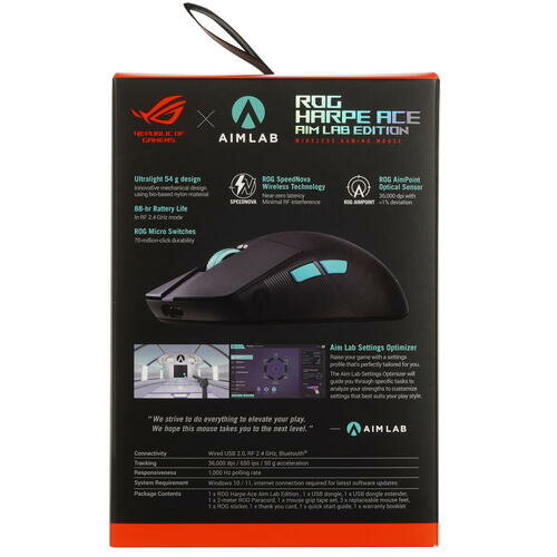 Мышь беспроводная/проводная ASUS ROG Harpe Ace Aim Lab Edition [] с черным корпусом симметричного дизайна одинаково удобна для удержания/перемещения как правой, так и левой рукой. Устройство ввода со стильной подсветкой на RGB-светодиодах допускает настройку чувствительности оптического датчика в диапазоне 100-36000 dpi. Для точного выбора оптимального уровня разрешения светодиодного сенсора на корпусе мыши предусмотрен специальный переключатель.Для подключения геймерской компьютерной мыши ASUS ROG Harpe Ace Aim Lab Edition [] к ПК или ноутбуку можно использовать Bluetooth или радиоканал, так и отсоединяемый кабель. При выборе беспроводного подключения устройство получает питание от аккумулятора, который не нуждается в подзарядке на протяжении как минимум 90 ч работы.