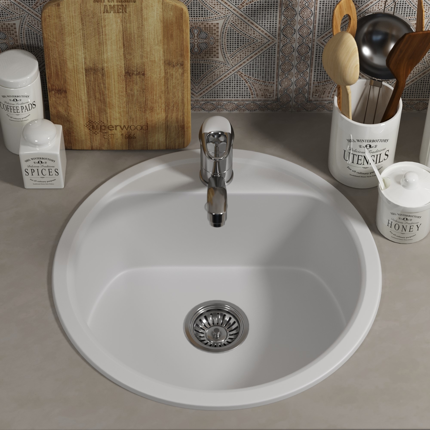 Круглая каменная мойка из кварцевого песка с отверстием для смесителя и увеличенной чашей от бренда Uperwood.