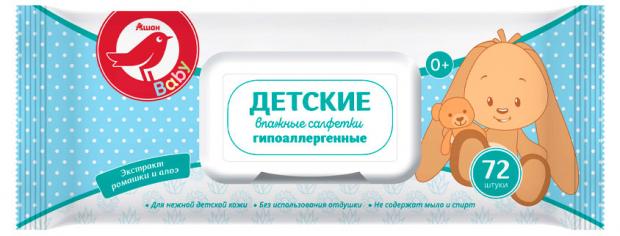 Салфетки влажные детские АШАН Красная птица гипоаллергенные, 72 шт