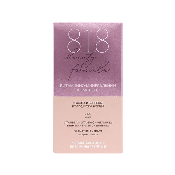 Состав:лактоза; аскорбиновая кислота; токоферола ацетат; пантотеновая кислота; цинка сульфат; пиридоксина гидрохлорид; ретинола ацетат; фолиевая кислота; биотин; йодистый калий; холина битартрат; инозит; холекальциферол; цианокобаламин; Экстракт граната; экстракт виноградных косточек; экстракт травы хвоща полевого; магниевая соль стеариновой кислоты8.1.8 BEAUTY FORMULA – трехфазная система профилактики и защиты кожи от стресса. 8.1.8 BEAUTY FORMULA производится на контрактных площадках в Грузии и России, а также на своем собственном производстве в России. Производственные линии соответствуют актуальным международным стандартам. комплекс витаминов для женщин, для кожи, волос и ногтей. Дополнительный источник витаминов и минералов для женщин. женские витамины комплекс, Улучшает состояние волос, кожи, ногтей. Комплекс витамины для волос, рекомендуется в качестве биологически активной добавки к пище – дополнительного источника витаминов А, D3, E, B5, B6, B9, B12, С, биотина, йода, цинка, источника проантоцианидинов для взрослых. Активные ингредиенты витамины для кожи волос и ногтей, :биотин влияет на формирование и обновление волосяных луковиц. Содержание в капсуле 150 мкг, что соответствует 300 % от рекомендуемого суточного потребления.витамины группы B способствуют укреплению структуры волос.цинк способствует поддержанию здоровья кожи головы. Стимулирует синтез коллагена и кератина.витамин А защищает волосы и ногти от ломкости и тусклости.витамин С положительно влияет на питание волосяных луковиц. Корректирует возрастные изменения на коже.витамин D3 способствует укреплению волос и ногтей, придает блеск и гладкость. Обеспечивает коже сияние.витамин E – антиоксидант, улучшающий состояние волос и омолаживающий кожу.экстракт граната является источником железа. Способствует восстановлению эластичности волос, укреплению ногтей.экстракт виноградных косточек воздействует на организм в целом. Защищает от окислительного стресса. Улучшает цвет лица.экстракт травы хвоща полевого – источник кремния, который укрепляет капилляры. Усиливает защитные силы организма. Способ применения: Взрослым по 1 капсуле 1 раз в день во время еды. Продолжительность приема – 1 месяц. При необходимости курс можно повторить.Состав: витаминный премикс (лактоза, аскорбиновая кислота, токоферола ацетат, пантотеновая кислота, цинка сульфат, пиридоксина гидрохлорид, ретинола ацетат, фолиевая кислота, биотин, йодистый калий, холина битартрат, инозит, холекальциферол, цианокобаламин, экстракт граната, экстракт виноградных косточек, экстракт травы хвоща полевого, оболочка капсулы (желатин, диоксид титана (краситель)), магниевая соль стеариновой кислоты (антислеживающий агент).Противопоказания:Индивидуальная непереносимость компонентов продукта, беременность, кормление грудью, состояния, при которых противопоказаны препараты йода. Перед применением рекомендуется проконсультироваться с врачом. Лицам с заболеваниями щитовидной железы проконсультироваться с врачом-эндокринологом.