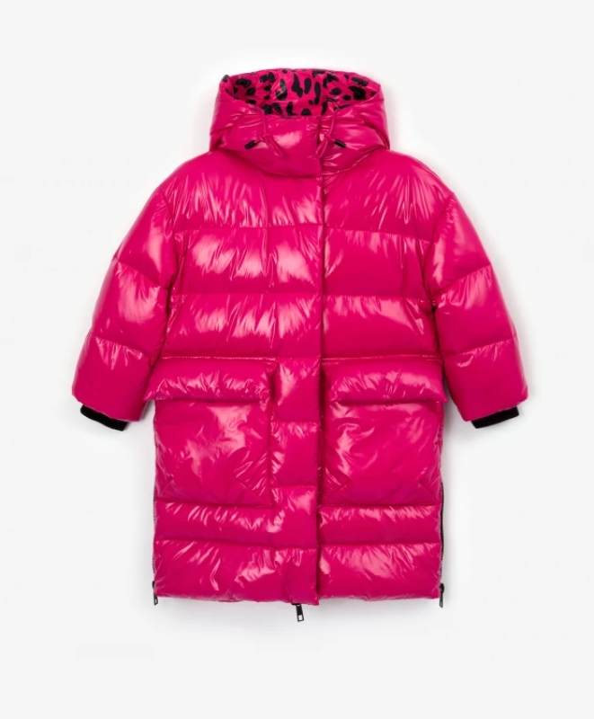 Зимнее пальто с капюшоном, на натуральном пуху, позволит чувствовать себя уютно, комфортно, защищенно в самые морозные дни! Выполненное из яркой глянцевой плащовки цвета фуксии, пальто выглядит стильно, убедительно, добротно. Свободный объем, прямая форма, спущенное плечо формируют модный силуэт и современные пропорции в образе. Крупные накладные карманы с уютной флисовой подкладкой и объемные воздушные клапаны придают пальто законченный вид. В оформлении модели использованы черные тракторные молнии и черные детали отделки, подкладка, создающие цветовой и фактурный контраст. Молнии в боковых швах и двойные пуллеры на центральной застежке позволяют корректировать объем изделия внизу для комфортного шага. На спинке изделия расположен светоотражающий шеврон.