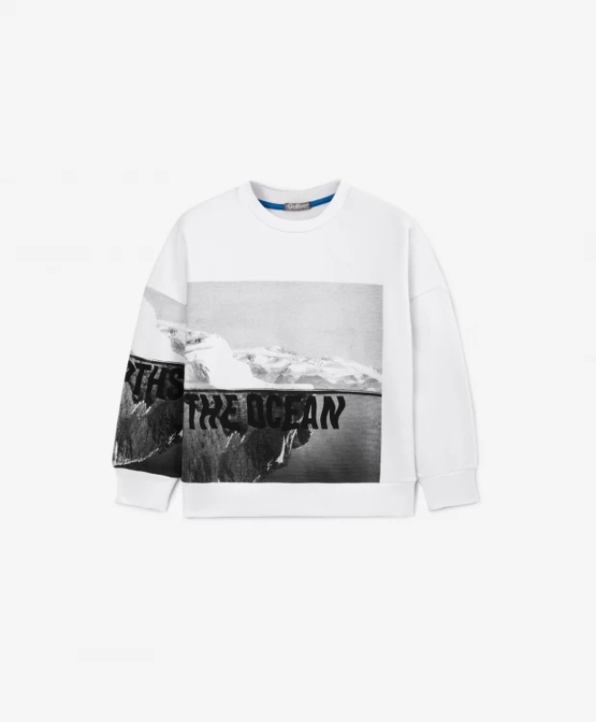 Объемный белый свитшот с фото принтом, расположенным асимметрично, - стильный, благородный, интересный вариант. Модный свободный объем делает свитшот очень комфортным. Небольшой цветной акцент, интегрированный в шрифтовой декор на спинке, красиво дополняет черно-белое изображение, подчеркивает лаконичный интеллектуальный дизайн модели. Свитшот выполнен из футера с начесом на изнаночной стороне, гарантирующего тепло, уют, приятные тактильные ощущения.