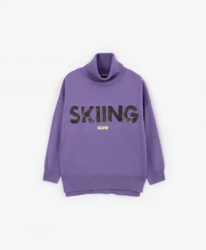 Вязаная водолазка модного фиолетового цвета - теплая, мягкая, интересная вещь. Современная форма, длина, объем делают водолазку очень уютной и удобной. Интересный декор из черно-белых пайеток(антистресс) и яркого шрифтового принта придает модели оригинальность и остроту. Трехкомпонентный состав пряжи, приятной на ощупь, исключает колкость изделия, что важно для комфортной эксплуатации вещи.