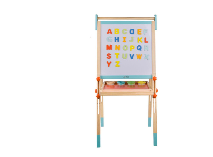 В комплект к доске идёт 26 магнитных букв (английский алфавит). Доска выполнена из натурального дерева, для её производства использованы безопасные для здоровья краски. 4 пластиковых стаканчика входят в комплект. Мольберт может регулироваться по высоте.