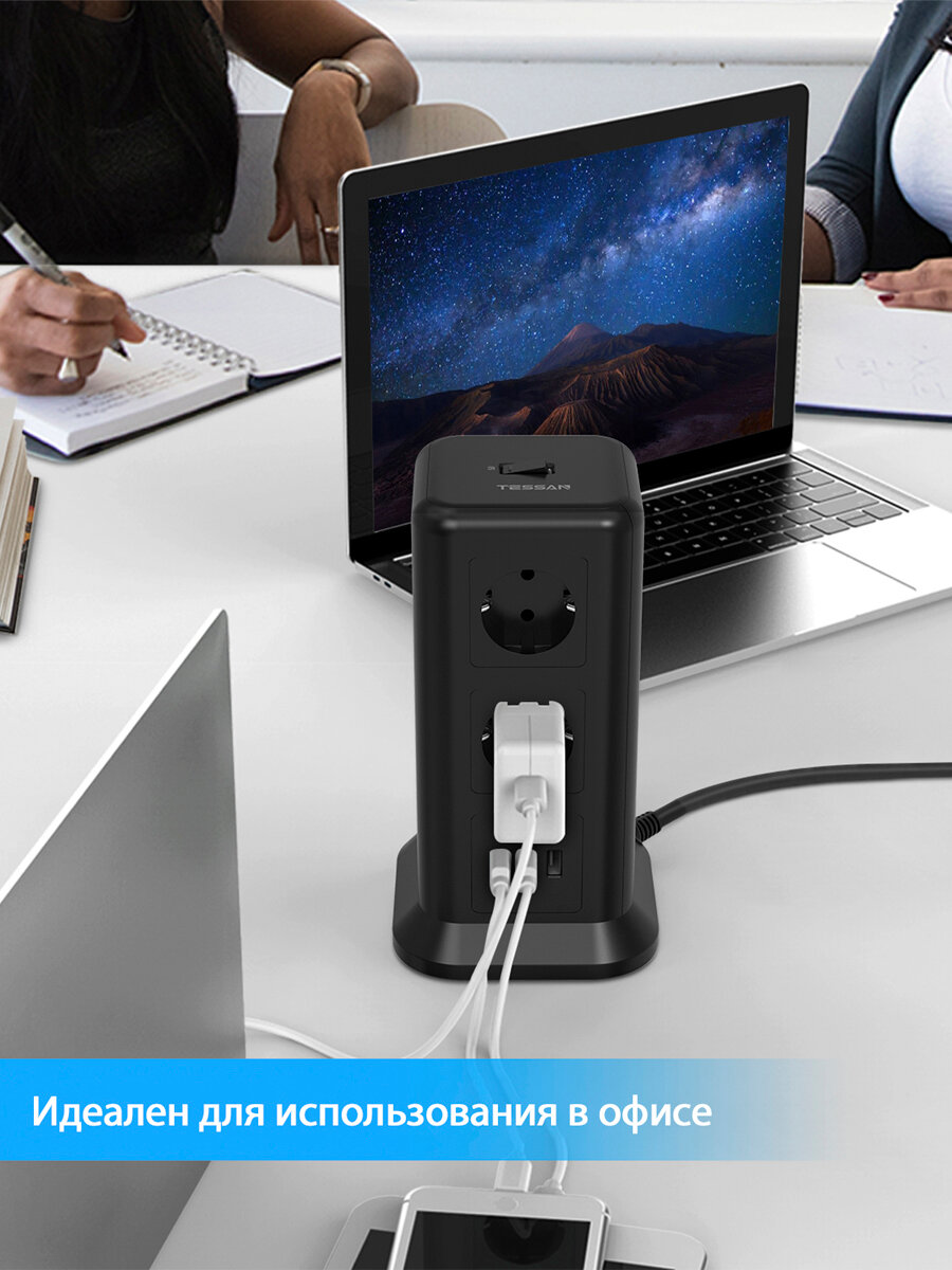 Сетевой фильтр TESSAN 11 евророзеток 220В и 3 USB и кн. питания, 2500Вт, до 10А, кабе TPS01-DE Black