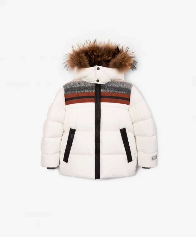 Светлая куртка всегда выглядит ярче, интереснее, свежее! Выполненная из плотной влагостойкой плащовки, на искусственном пуху, молочная куртка с яркой отделкой отражает тренд на сочетание фактур. Плащовка, драп, жаккардовая тесьма - интересный микс, создающий цветовой и фактурный контраст. Он поддержан черными литыми молниями и орнаментальной подкладкой, свидетельствующей о принадлежности куртки к коллекции Gulliver "Скифы". Капюшон завершен отстегивающимся натуральным мехом енота, создающим ощущение тепла, уюта, защищенности. Куртка имеет важный функционал для комфортного времяпрепровождения ребенка и на улице, и в помещении. Снегозащитная "юбка" сделает прилегание куртки плотным, препятствующим продуванию и попаданию снега внутрь. Лямки на подкладке помогут в помещении носить куртку за спиной как рюкзак, оставляя руки свободными.