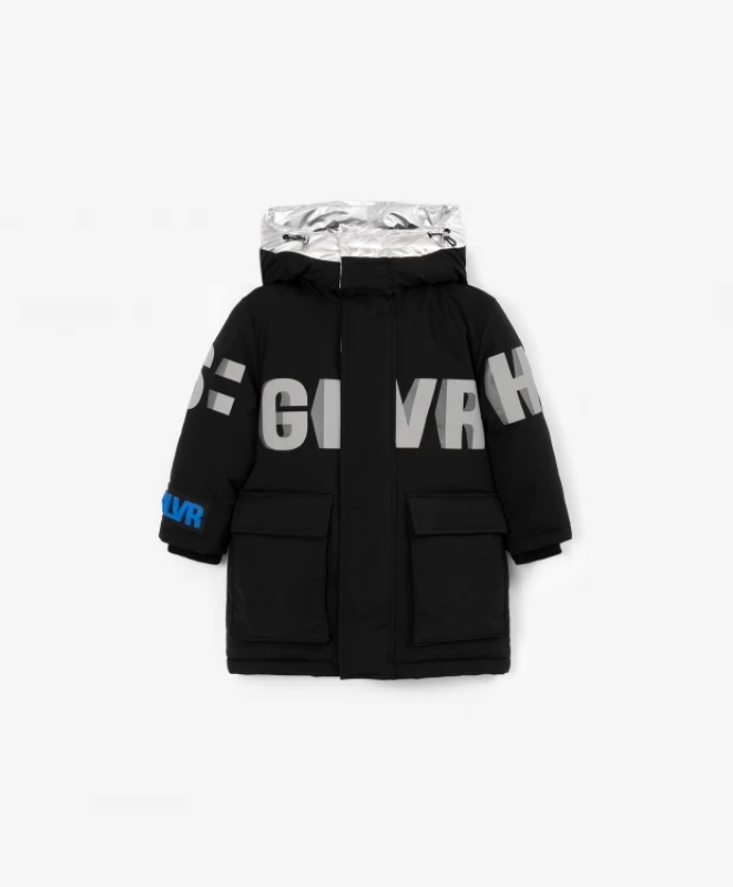 Теплое зимнее пальто на искусственном пуху не позволит мальчику остаться незамеченным! Черное пальто с крупными светоотражающими шрифтовыми элементами на спинке, полочке, рукавах - гарантия яркого образа, который сделает безопасным пребывание ребенка на улице в вечернее время. Сочетание основной - черной матовой плащовки и блестящей серебристой плащовки в отделке делает пальто интереснее и ярче. Орнаментальная подкладка с 3D графикой придает модели индивидуальные черты, объединяя с другими элементами из коллекции Gulliver "Айсберг". Крупные объемные накладные карманы на уютной флисовой подкладке делают пальто очень удобным для мальчика. В оформлении модели использован резиновый шеврон с яркими объемными буквами. Важная деталь, существенно повышающая функциональные качества изделия, - эластичные лямки на подкладке, позволяющие в помещении носить пальто за спиной как рюкзак, оставляя руки свободными.