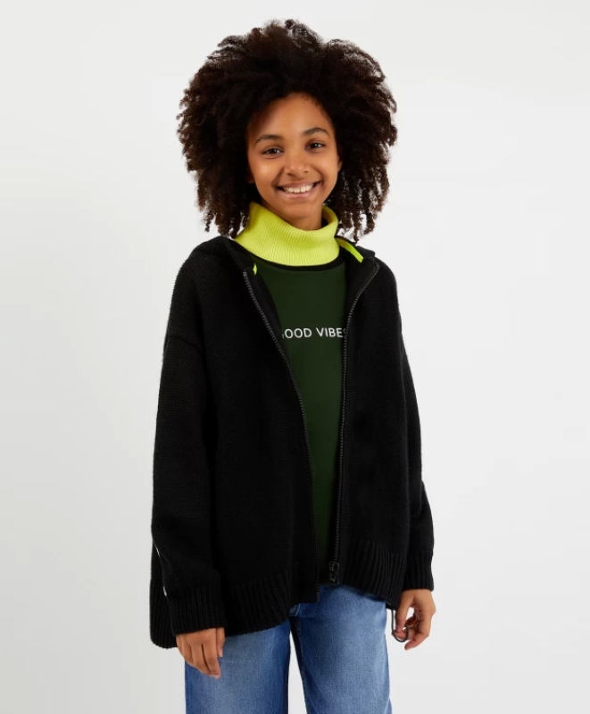 Теплый вязаный кардиган с капюшоном - полноценная верхняя вещь, которую можно носить, чувствуя себя комфортно даже в самые холодные осенние дни. Форма оверсайз формирует модный современный объем, позволяющий создавать многослойные образы. Плотность, качество, состав пряжи говорит о добротности, надежности, убедительности вещи. Дизайн модели, построенный на черно-белой графике, созданной благодаря широкой контрастной трикотажной тесьме, идущей непрерывно по спинке и рукавам, наделяет модель яркими приметами спортивного стиля, делает кардиган уникальным. В оформлении модели использован резиновый шеврон с шрифтовыми элементами, а также зиппер-пуллеры из светоотражающего шнура, расположенные на центральной застежке и карманах.