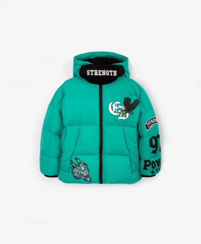 Зимняя куртка на натуральном пуху - гарантия тепла, уюта, комфорта! Выполненная из матовой влагостойкой плащовки модного зеленого цвета, стеганая куртка не позволит мальчику остаться незамеченным. Дизайн модели построен на контрасте основного полотна и черной отделки, а также на интересных декоративных шрифтовых принтах и фигурных нашивках. Шрифты в готическом стиле, диковинные существа, птицы задают тон, наделяют модель остротой и экстравагантностью, делают куртку насыщенной и яркой. Съемный элемент, прикрепляющийся кнопками в области шеи, создает дополнительную защиту в условиях непогоды. Контрастный принт на нем – strength (сила, прочность) - еще раз убеждает в добротности, практичности, продуманности вещи. Куртка имеет все необходимые утяжки - по капюшону и низу изделия, способствующие усилить ветрозащитность изделия. Внутренние эластичные лямки позволяют в помещении носить куртку за спиной как рюкзак, оставляя руки свободными.