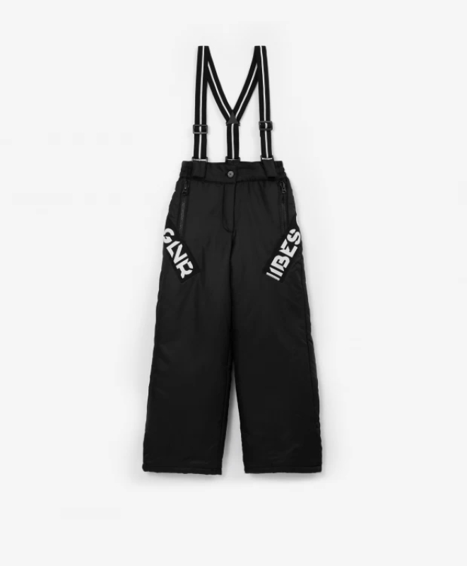 Утепленные брюки с отстегивающимися лямками из эластичной тесьмы - незаменимая составляющая зимнего гардероба девочки. Выполненные из плотной черной плащовки с водоотталкивающим эффектом, брюки обладают беспрецедентной практичностью и высокой износостойкостью. Дизайн модели построен на крупной шрифтовой графике. Широкая жаккардовая тесьма с контрастными буквами, переходящая с передней части на задние половинки брюк, подчеркивают остроту и незаурядность модели. Брюки имеют важные опции, характерные для зимней функциональной одежды: внутренние снегозащитные манжеты; карманы на тракторных молниях; светоотражающие принты для безопасного передвижения в темное время суток.