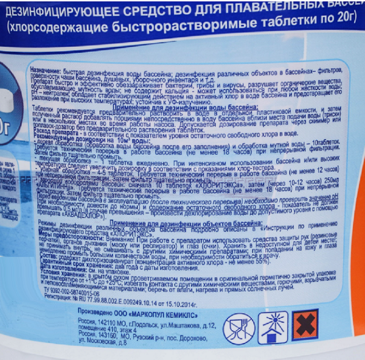 | Расход | 1-3 таблетки на 20 куб м воды ежедневно |