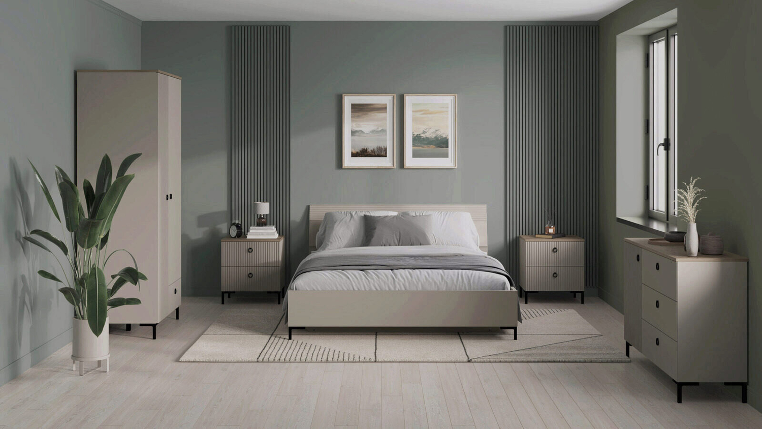 Спальня Zima — это интерьерное решение в актуальном современном стиле. Коллекция отличается стильными фрезерованными вставками, элегантными металлическими ножками.