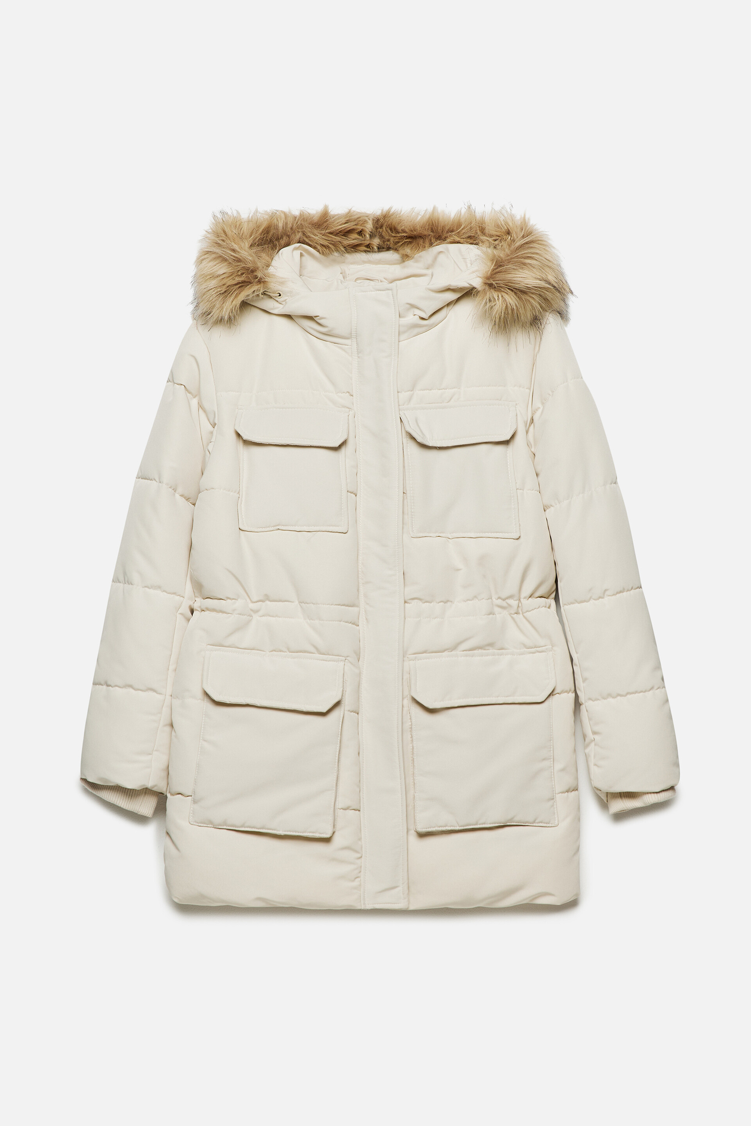 - Объемный несъемный капюшон с воротником-стойкой, завязками и съемным искусственным мехом