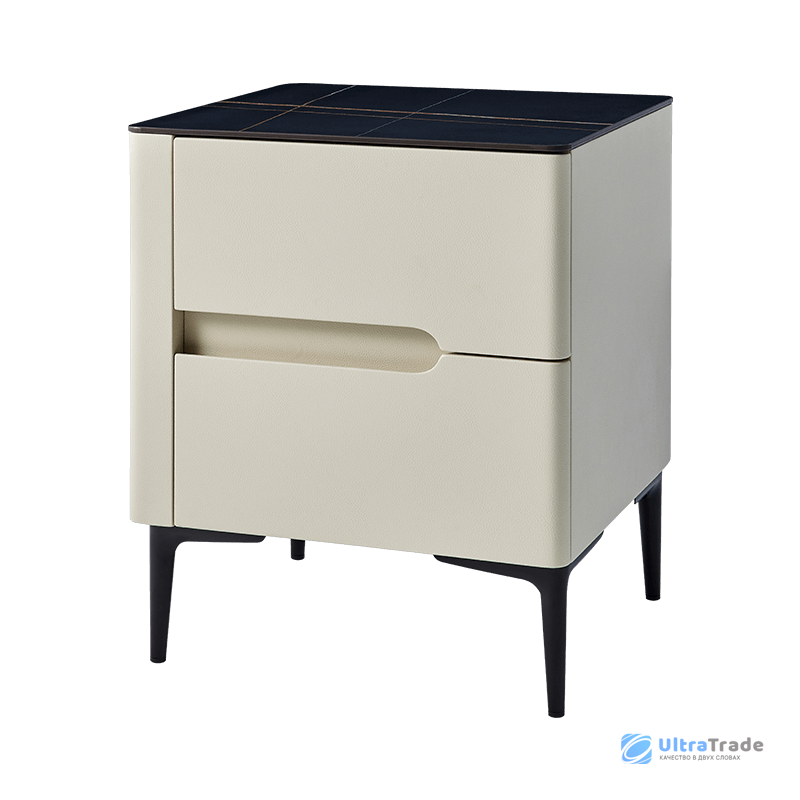 Столешница выполнена из прочного глянцевого материала, а корпус обит искусственной кожей, которая имеет высокие эксплуатационные свойства и приятна на ощупь. Высокие металлические ножки придают тумбочке дополнительную воздушность.
