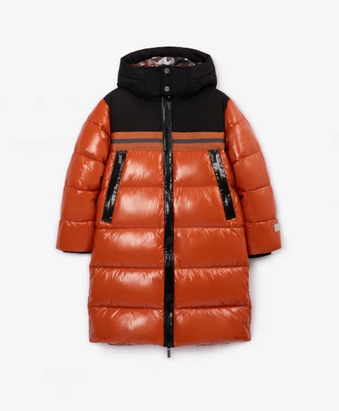 Теплое пальто на искусственном пуху - основа зимнего прогулочного гардероба! Построенное на колорблокинге и сочетании фактур, стеганое пальто выглядит потрясающе! Рыжая глянцевая и черная матовая плащовки создают цветовой и фактурный контраст, делают пальто модным, острым, небанальным. Он поддержан стильными и интересными деталями: широкой жаккардовой тесьмой, литыми глянцевыми молниями на центральной застежке и карманах, подкладкой с абстрактным рисунком. Брутальный зиппер-пуллер, служащий красивым завершением, подчеркивает уникальный дизайн модели. Пальто оснащено лямками на подкладке, позволяющими в помещении носить его за спиной как рюкзак, оставляя руки свободными.