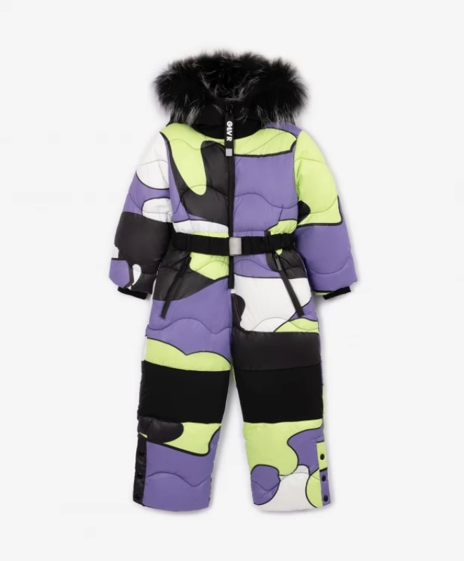Теплый стеганый комбинезон на искусственном пуху - прекрасная возможность сделать зимнюю прогулку продолжительной и комфортной! Выполненный из влагостойкой плащовки с крупным рисунком, на подкладке из флиса, комбинезон выглядит ярко, остро, экстравагантно. Яркий принт, построенный по принципу колорблокинга, поддержанный фигурной стежкой, наделяет модель активной динамичной графикой, придающей изделию уникальность. В дизайне и оформлении модели использованы черные детали отделки, пояс, подкладка, создающие цветовой и фактурный контраст. Комбинезон обладает всем необходимым функционалом для прогулки в любую погоду. Снегозащитные внутренние манжеты, шлицы на боковых швах, застегивающиеся на кнопки, влагостойкие литые молнии на центральной застежке и карманах делают комбинезон удобным, добротным, практичным. На спинке изделия расположен стильный светоотражающий принт. Капюшон комбинезона завершен отстегивающимся натуральным мехом енота.