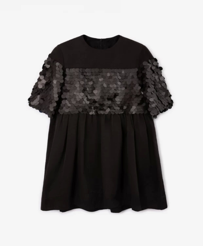 Черное платье с коротким рукавом - образец элегантности и комфорта! Модное свободное платье трапециевидной формы построено на геометрии и сочетании фактур. Широкая горизонтальная вставка, выполненная из сетки с крупными черными матовыми пайетками, придает модели остроту, выразительность, оригинальность. Ее играющая, блестящая и находящаяся все время в движении поверхность красиво контрастирует с гладкой фактурой основного материала, создавая потрясающий визуальный эффект. Подкладка платья сделана из тонкого хлопка, очень приятного тактильно. Платье застегивается на потайную молнию на спинке.