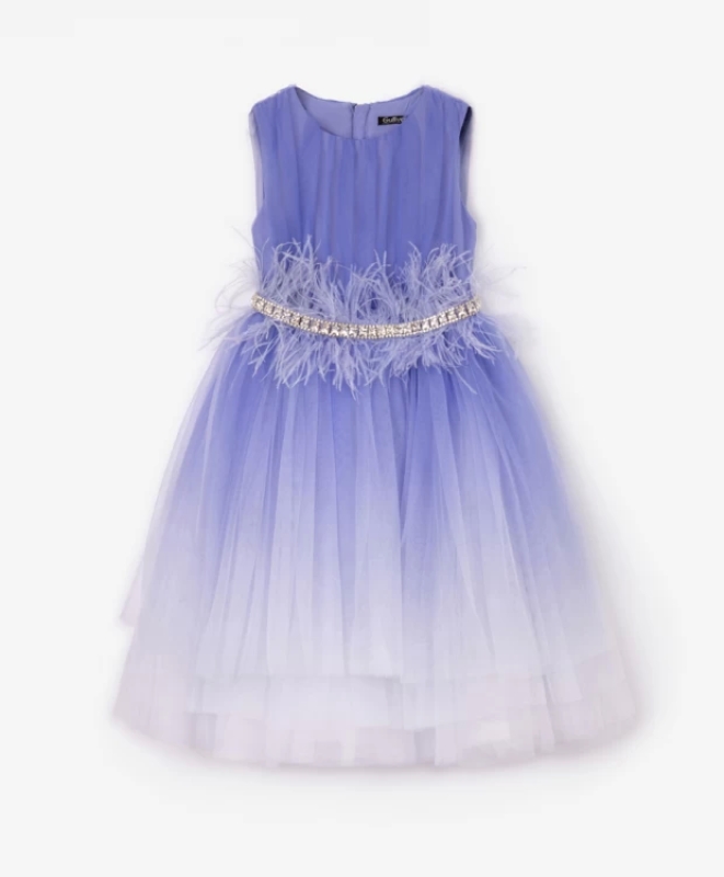 Легкое воздушное платье подчеркнет красоту и торжественность момента! Выполненное из тонкой сетки, драпированной на лифе, и усиленной несколькими слоями разной длины на юбке, платье смотрится безупречно. Бесспорным украшением его является градиентный цветовой переход от нежного разбеленного лавандового до глубокого сиреневого, и оригинальный пояс, оформленный крупными сияющими стразами и невесомыми страусиными перьями. Платье имеет комфортную хлопковую подкладку. Металлическая молния является и функциональным, и декоративным элементом, делая платье острее, современнее, ярче.