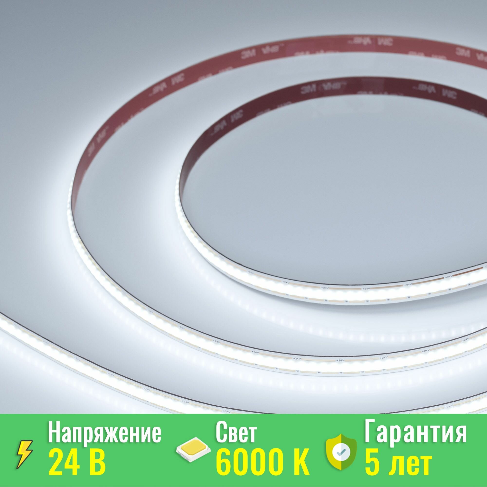 Лента COB сплошной засветки без видимых светодиодов. Светодиоды CSP 480 шт/м. Цвет свечения ТЕПЛЫЙ 2700K, высокий индекс цветопередачи CRI>90, угол 160°. Мощность 10 Вт/м, питание 24 В. Размеры 5000х10х2.2мм. Мин.отрезок - свободная резка. Скотч 3М для установки. Цена за 1м.