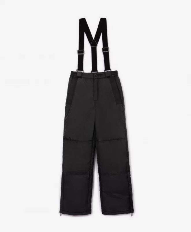 Черные утепленные брюки с отстегивающимися эластичными лямками - изделие из разряда must have! Выполненные из плотной влагостойкой плащовки, брюки соответствуют важному функциональному назначению. Снегозащитные внутренние манжеты, литые влагостойкие молнии на боковых швах для регулировки объема изделия внизу, уплотненная дополнительным слоем коленная зона, карманы делают брюки продуманными и комфортными. В оформлении модели использованы светоотражающие шрифтовые элементы, способствующие безопасности ребенка в темное время суток.
