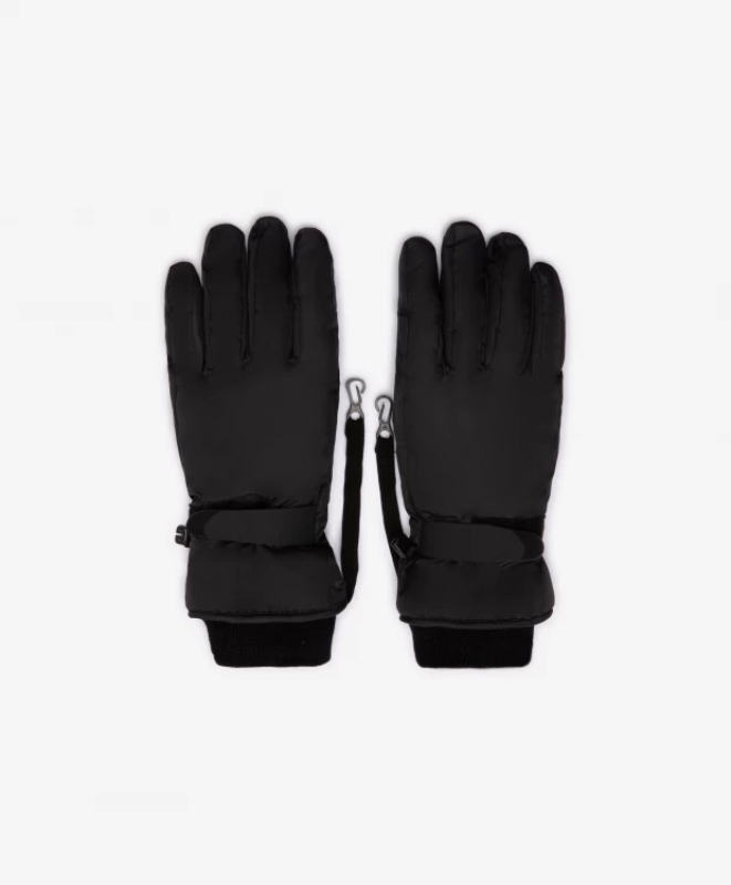 Черные плащевые перчатки на синтепоне - практичный и функциональный зимний аксессуар! Ладонная часть перчаток защищена специальным протектором, способствующим износостойкости изделия. В оформлении модели использована яркая тесьма-петля.