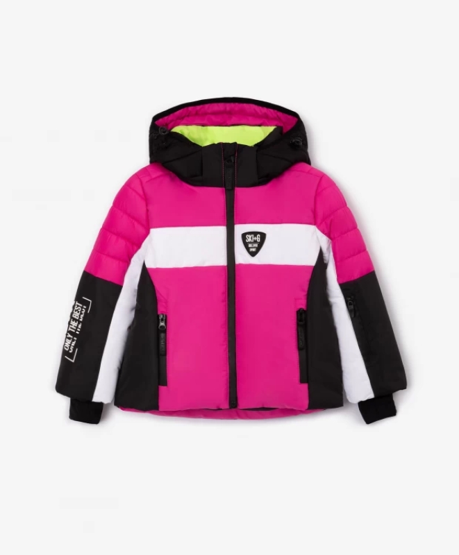 Яркая спортивная куртка, построенная на цветовом контрасте, динамичной отделке и продуманных конструктивных и технологических деталях, отвечающих основным требованиям любительниц зимних видов спорта, сделает образ девочки стильным и энергичным! Стеганая куртка на искусственном пуху и подкладке из флиса выглядит интересно благодаря модному выразительному дизайну: колорблокингу, сочетанию плотной и мягкой плащовок, комбинации стеганых и гладких деталей, ярким элементам оформления. Среди них – резиновый шеврон, множество шрифтовых принтов, в том числе со светоотражающим эффектом, оригинальные зиппер-пуллеры. Кроме того, куртка обладает целым рядом функциональных деталей, создающих удобство и комфорт в эксплуатации вещи:
