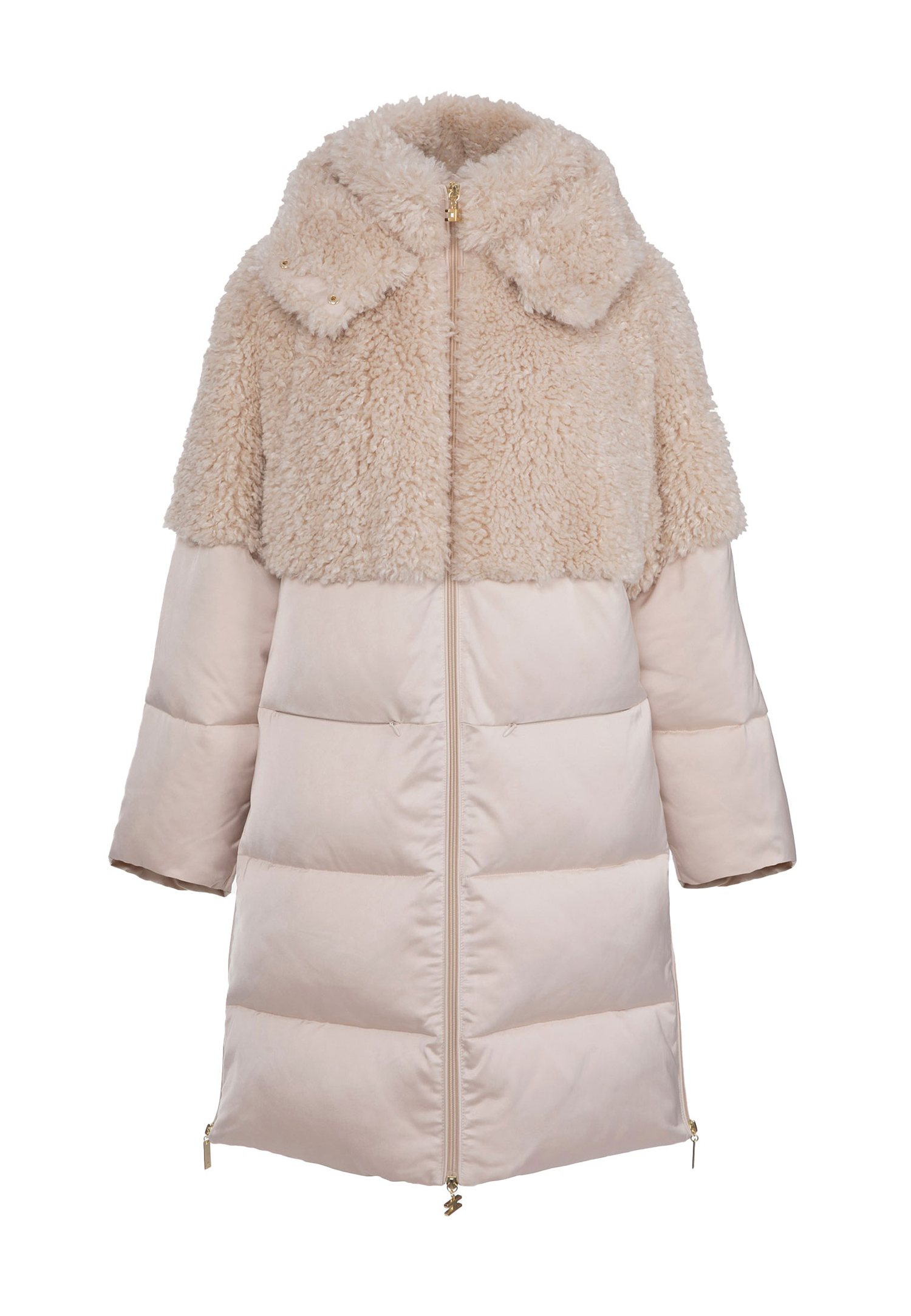 Даже повседневный объёмный пуховик Элизабетта Франки превратила в стильное стеганое пальто, правильно сочетая текстуру материалов. Сшив нижнюю часть из прочного непромокаемого нейлона, верх был исполнен из ворсистого экомеха, а уютный и функциональный капюшон оригинально обыгран широким отложным воротником. Кремовый оттенок выгодно оттенила фурнитура традиционного золотистого цвета с фирменными деталями. Для удобства в передвижении предусмотрены молнии по бокам.