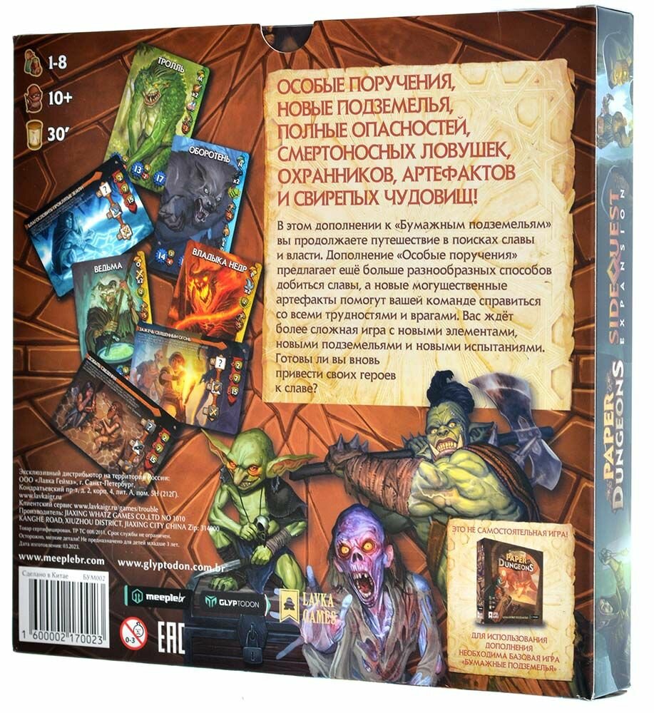 Принеси-подай Кто-то любит эпические сюжеты основной линии, когда главный герой оказывается избранным, побеждает самое злобное зло, купается в лучах славы и обожания. Другие же открывают карту, сканируют её на предмет “вопросиков” и отправляются на извилистый путь закрытия сайд-квестов. Дополнение “Бумажные подземелья. Особые поручения” отлично подойдёт второму типу игроков. Обнюхать каждый угол Теперь подземелья наполнены не только сыростью, плесенью и страшными монстрами, но и дополнительными персонажами, которые будут давать задание. Их выполнение принесёт вам, конечно, удовольствие, а ещё – новые шмотки, оружие и ингредиенты для зелий. В начале игры каждый игрок получает по две карты дополнительных заданий, так что, если вы не любитель бездумно растрачивать время на помощь всяким сомнительным личностям, то вправе отказаться от выполнения поручений, даже штрафов за это не предусмотрено. Новый опыт Дополнение добавляет в игру не только сайд-квесты, но и ещё много всякого. Например, теперь в подземельях можно отыскать сундуки с полезным лутом, но обычно их охраняют стражи, так что придётся побороться за добычу. Добавлены новые магические артефакты, такие как кольцо телепортации, свиток знания и волшебная отмычка. Передвигаться по подземельям стало сложнее – добавлены непроходимые зоны и куча разных ловушек, поэтому смотрите под ноги!