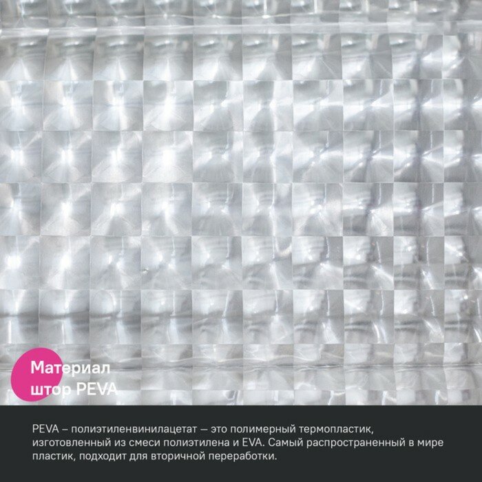 Полупрозрачная 3D-штора для ванной с рисунком из маленьких квадратов. Изготовлена из современного материала PEVA – мягкого, приятного на ощупь, экологичного и безвредного для здоровья термопластика (толщина 0,13 мм).• Без неприятного запаха, благодаря чему шторку для ванной можно использовать уже в день покупки.• В комплекте 12 прозрачных пластиковых колец С-формы.• По верхнему краю 12 штампованных отверстий-люверсов – кольцо/крючок легко пройдет насквозь, не повредив шторы.• Материал PEVA на 100% водонепроницаем и надежно защищает от брызг, не подвержен развитию плесени и грибка.• Просто ухаживать: достаточно протереть салфеткой с мылом и промыть под душем. При этом штору можно даже не снимать с карниза.Гарантия на текстильные аксессуары IDDIS® – 1 год.