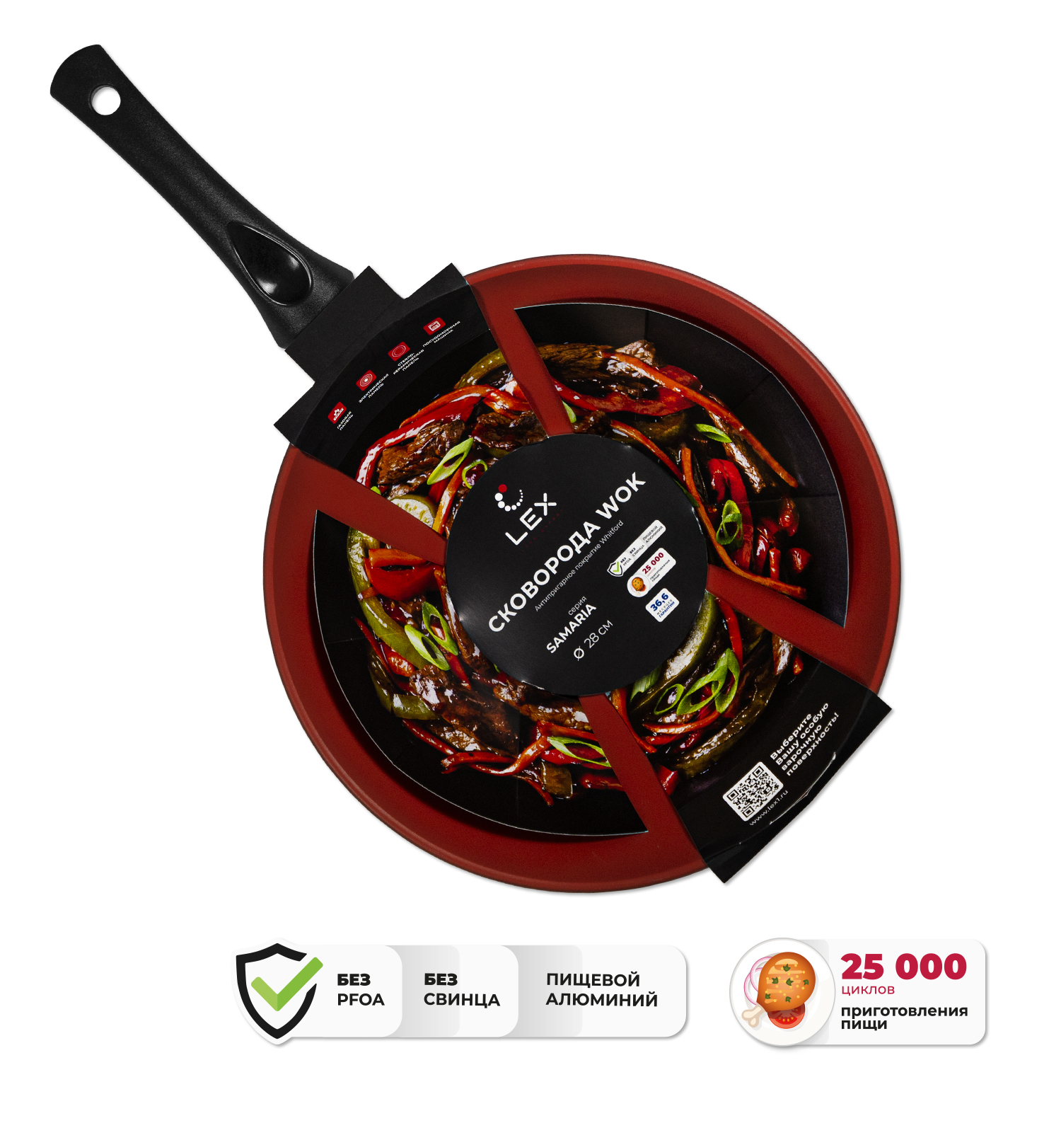 Посуда не менее важна, чем пища в ней.Изделие: не содержит PFOA (кислоты) и является абсолютно безопасным; имеет диаметр 28 см и высоту стенки 11,5 см; подходит для всех видов варочных поверхностей; позволяет готовить без масла и использовать лопатки из металла; можно мыть как в посудомоечной машине, так и под проточной водой.Антипригарная сковорода на 100% состоит безопасных, нетоксичных материалов. Сверхпрочный, твердый алюминиевый корпус изготовлен по технологии литьевого производства, покрыт базовым слоем Quantanium, усиленным титановыми частицами, промежуточным слоем и финишным металликом. Покрытие сковороды от бренда Whitford имеет уникальную текстуру с антипригарными свойствами, устойчиво к царапинам, истиранию и гарантирует длительный срок эксплуатации. То, что Wok оптимально разогрет, легко определить по тому, как покрытие приобретает более темный оттенок.Эргономичная ручка остается холодной в процессе приготовления. Soft-touch поверхность имеет хромированную вставку, и не скользит, даже если взять сковороду мокрыми руками.Wok LEX — самый здоровый способ готовить.