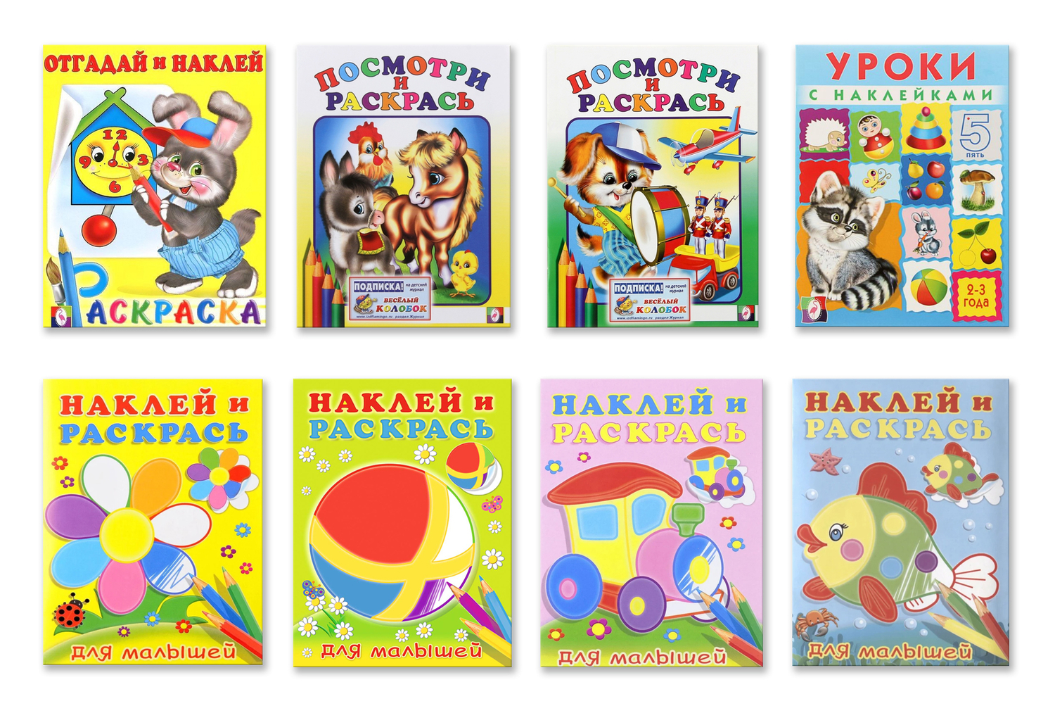 В комплект входит 8 книг для детей 2-3 лет : "Уроки для малышей 2-3 года", "Зайчонок", "Мячик", "Паровоз", "Рыбка", "Цветок", "Барабан", "Лошадка" . Раскраски с веселыми картинками для самых маленьких, созданные по принципу «посмотри и раскрась», а также книжки с наклейками.