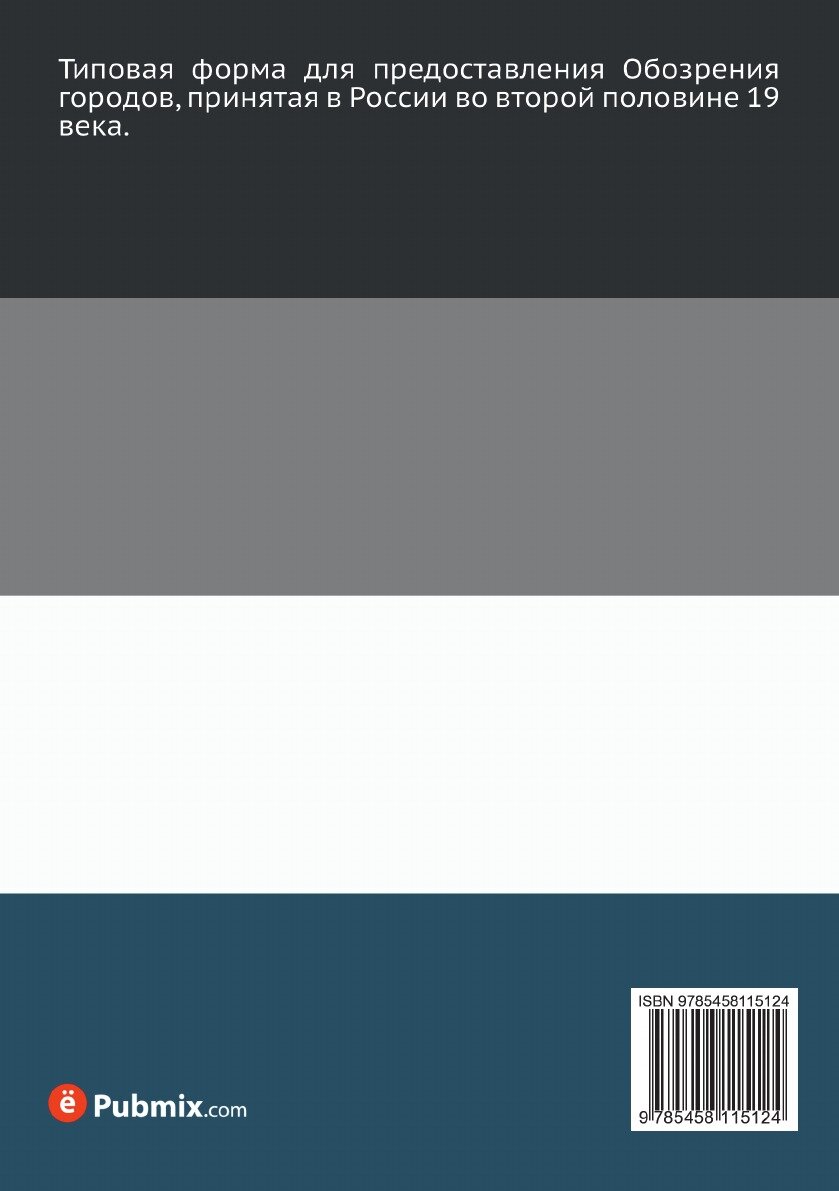 Эта книга — репринт оригинального издания (издательство "Санкт-Петербург", 1856 год), созданный на основе электронной копии высокого разрешения, которую очистили и обработали вручную, сохранив структуру и орфографию оригинального издания. Редкие, забытые и малоизвестные книги, изданные с петровских времен до наших дней, вновь доступны в виде печатных книг._x000D_ _x000D_ Типовая форма для предоставления Обозрения городов, принятая в России во второй половине 19 века.