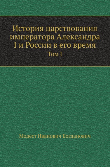 «История царствования императора Александра I и России в его время» вышла в свет в 1869–1871 гг. Ее автор, Богданович Модест Иванович (1805–1882), — генерал-лейтенант, военный писатель. В 1831 г. участвовал в сражениях под Вавром, Гроховым, Дембе-Вельке и Рагозиным. Пройдя курс в военной академии, занял в ней кафедру военной истории и стратегии, был членом Военного совета, официальным военным историографом. Оставил после себя множество военно-исторических и исторических трудов, в которых интересуется, главным образом, политической историей; его попытки критически отнестись к создавшимся легендам были встречены официальными историками весьма недоброжелательно. Повествование разделено на две части: первая, заключающаяся в I–IV томах, охватывает события 1801–1815 гг.; вторая — V, VI тома — содержит исторический период после 1815 г. до кончины Александра I в 1825 г. При создании книги Богданович использовал сведения из государственных архивов, а также до того не издававшиеся документы: бумаги императора Александра I, графа П. А. Строганова, записки адмирала А. С. Шишкова, журнал морских походов Д. Н. Сенявина и др. Полный список источников, печатных книг и рукописей, приведен в конце шестого тома. Богатый фактический материал иллюстрируют карты театров военных действий и планы главных сражений.