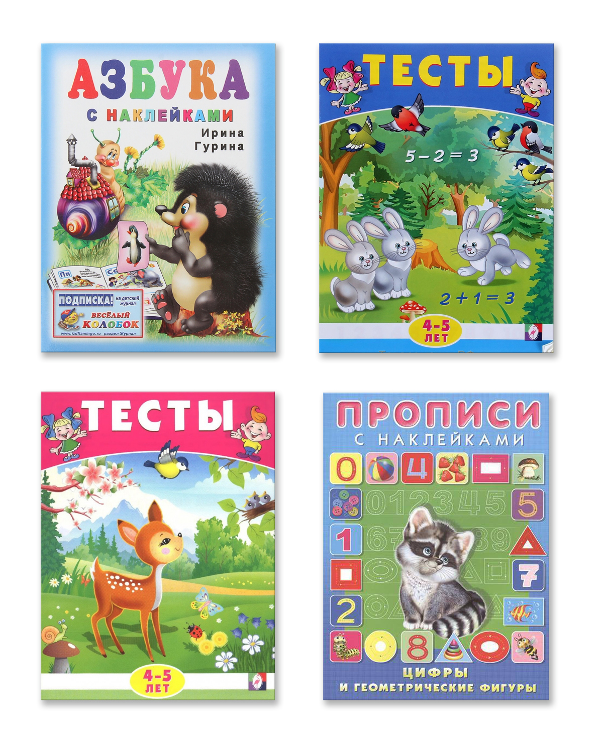 В комплект для ребенка 4-5 лет входит 4 книги: "Тесты 4-5 лет (математика)", "Тесты 4-5 лет (окружающий мир)", "Прописи с наклейками "Цифры и геометрические фигуры", "Азбука с наклейками". Они помогут занять ребенка с пользой, а родителям протестировать его уровень развития мышления, памяти, внимания, сенсорики, математических способностей и знаний ребёнка об окружающем мире.
