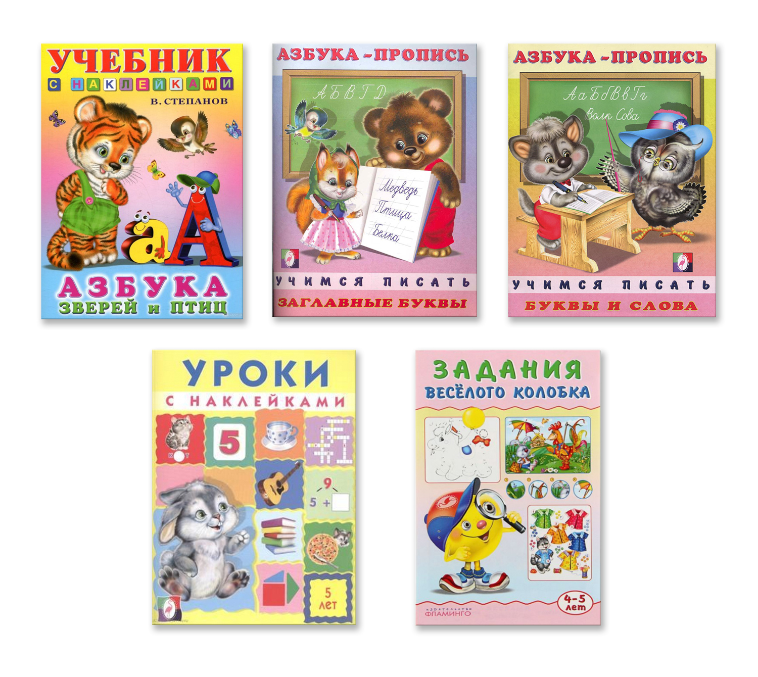 В комплект для ребенка 4-5 лет входят 5 книг: Hаклейки "Уроки для малышей 5 лет", Азбука-пропись "Буквы и слова", Азбука-пропись "Заглавные буквы", Учебник "Азбука зверей и птиц", "Задания Веселого Колобка 4-5 лет". Они помогут ребёнку в игровой форме развить зрительное восприятие, внимание, мелкую моторику и координацию движения руки. Занимайтесь с ребенком не более 20-25 минут.