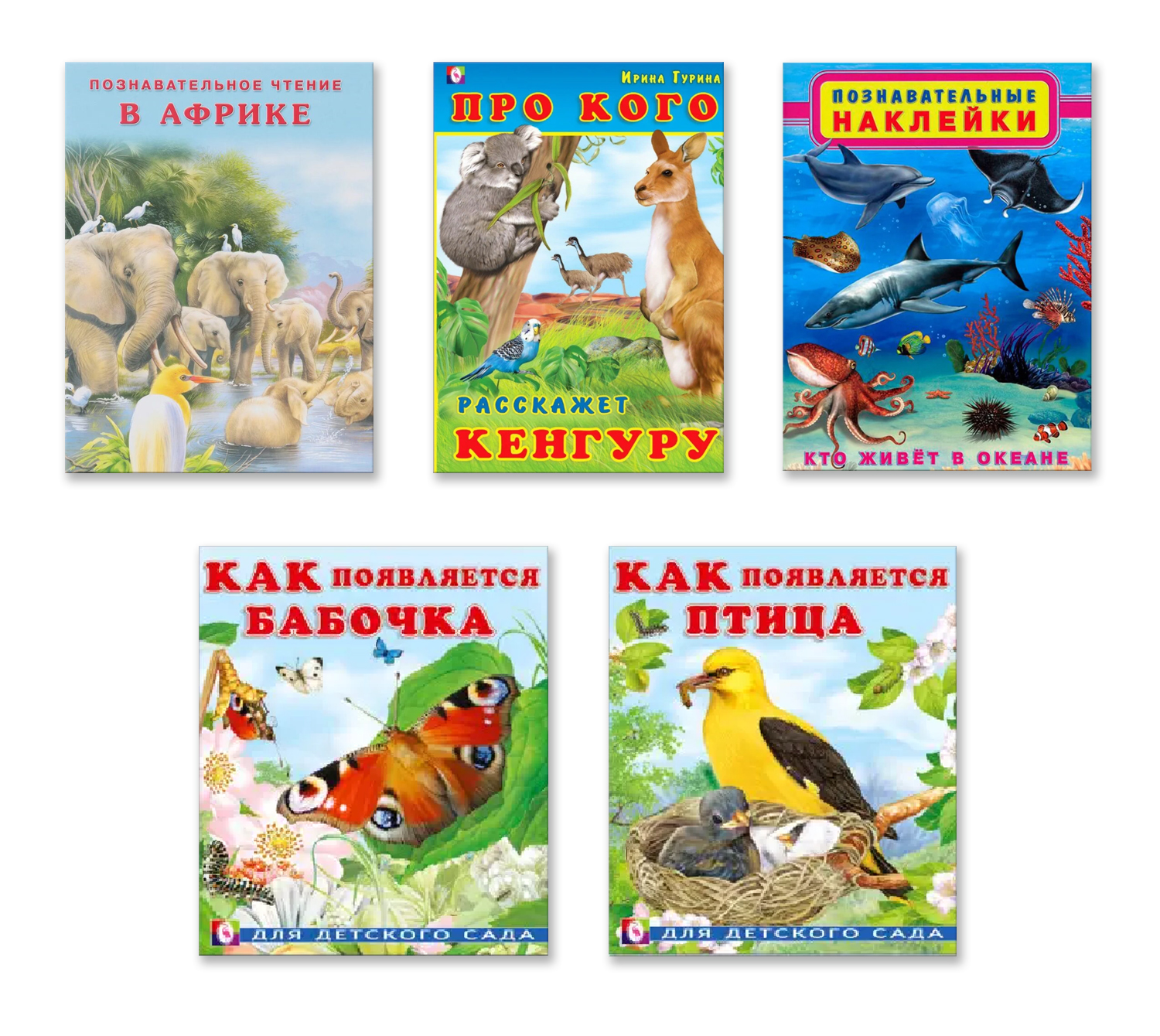 В комплекте 5 книг: "Про кого расскажет кенгуру", "В Африке", "Кто живет в океане", "Как появляется птица", "Как появляется бабочка". Книги с большим количеством ярких, реалистичных иллюстраций, помогающих ребёнку знакомиться с миром природы. В простой и понятной форме малышам рассказывается о том, как появляется и поэтапно развивается птица и бабочка. В конце каждой книги есть упрощённая схема процесса. Короткие тексты будут понятны даже самым маленьким читателям. "В Африке" - отличают изумительные реалистичные иллюстрации на каждом развороте и короткие развивающие тексты с новой лексикой, необходимой для развития речи. Издание является своего рода мини-энциклопедия о животном мире Африки. Рассказывает о зверях и птицах этого континента. Маленький читатель сможет в деталях рассмотреть длинношеих жирафов, полосатых зебр, удивительных фламинго и прочих африканских жителей. "Кто живет в океане" - полезная познавательная книжка с крупными изображениями животных в их естественной среде. Хорошо подходит для знакомства малышей с миром животных. На развороте место для наклеек, расчерченное на крупные квадраты, куда приклеиваются части общей картинки-мозаики с изображениями всех животных из этой книги. "Про кого расскажет кенгуру" - о животном мире Австралии.