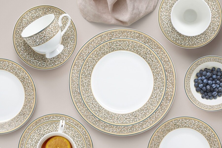 Коллекция сервизов "Мавритания" из костяного фарфора высочайшего качества напоминает нам о красоте восточной мозаики и магическом мире восточных сказок.
