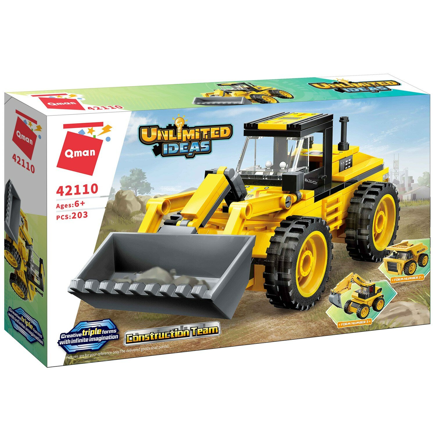 Из конструктора 3 в 1 от бренда QMAN из серии «Unlimited Ideas» ребенок может поочередно собрать собственными руками фигурки трех строительных машинки: трактор или экскаватор или самосвал. Простое и надежное соединение деталей разных размеров и форм между собой обеспечат специальные крепления. Во время игры ребенок сможет задействовать свою фантазию и придумать интересные сценарии. В процессе сборки и игры с готовой моделью юный конструктор будет развивать мелкую моторику рук, пространственное мышление, внимательность и усидчивость.