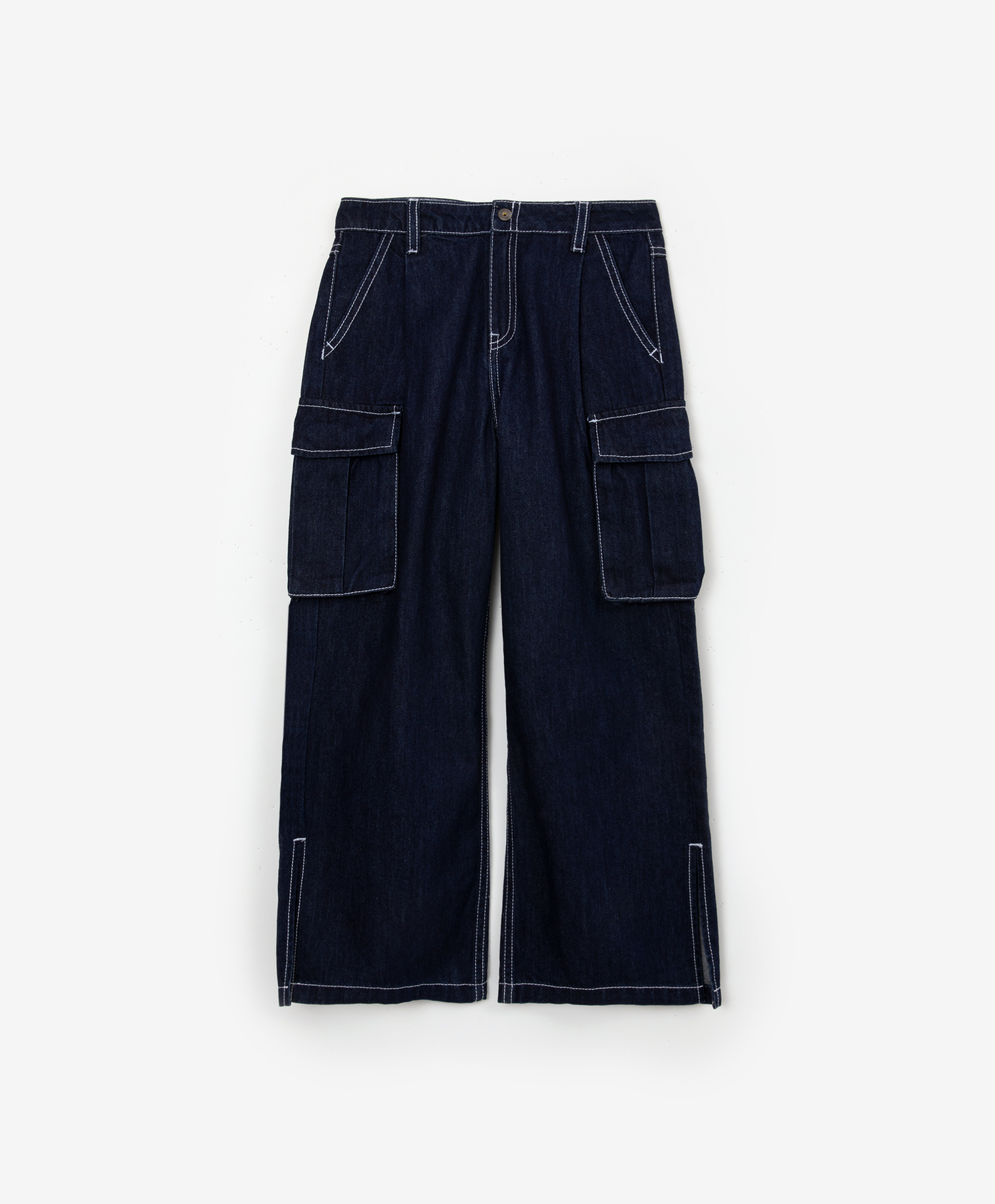 Синие широкие джинсы с высокими разрезами на боковых швах отражают актуальный тренд лета - необработанный деним(без потертостей и повреждений) с контрастной строчкой! Благодаря большому числу деталей: карманам карго с клапанами, карманам-лИсточкам, шлевкам, двойная отделочная строчка выглядит очень ярко, делая джинсы насыщенными и интересными. Для создания этой модели использован мягкий джинсовый материал, прошедший стирку для комфортной эксплуатации.