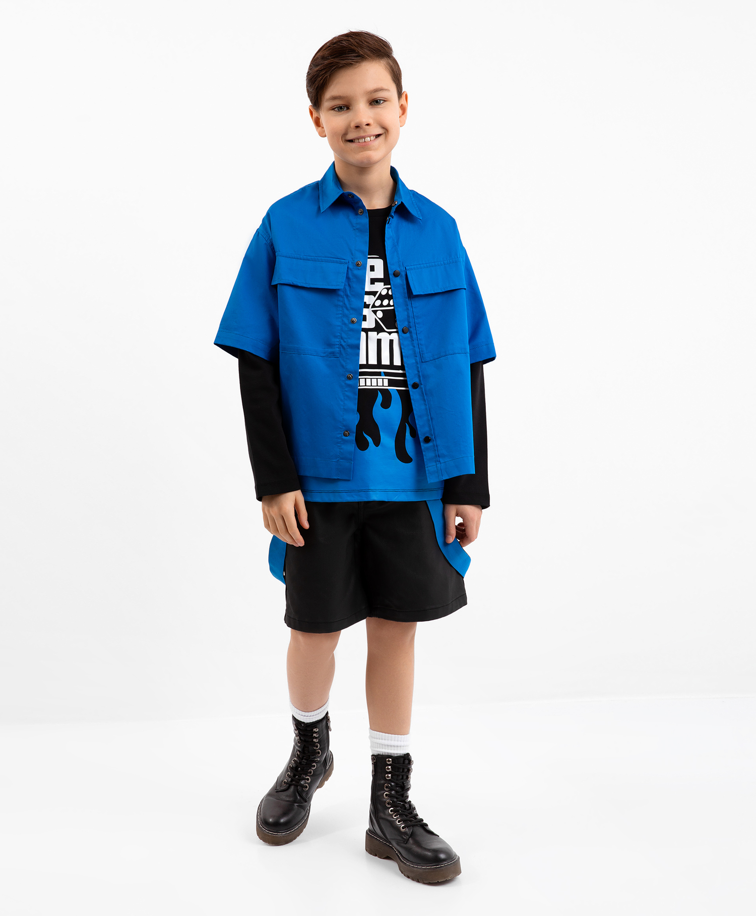 Черные шорты всегда выглядят стильно, брутально, уместно. Интересными их делает деним со специальной обработкой, создающей гладкую структуру материала с мокрым матовым блеском. При этом шорты не утрачивают мягкости, пластичности, комфорта в эксплуатации и прекрасных свойств 100% хлопка, гарантирующих хороший воздухообмен и приятные тактильные ощущения. В оформлении шорт использована яркая эластичная тесьма, служащая поясом и имитирующая подтяжки, а также резиновая нашивка с шрифтовыми элементами.