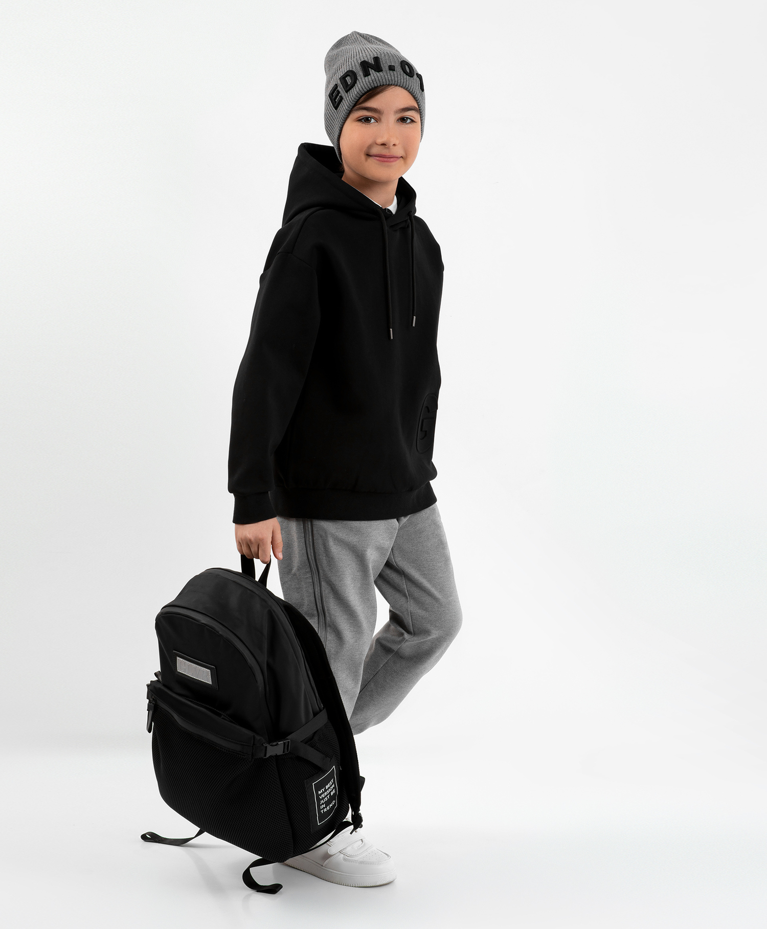 Черная толстовка с капюшоном - идеальное решение для будней мальчика. И для школы, приветствующей комфортные образы в стиле sport, и для свободного времени, черная толстовка из плотного, формоустойчивого и практичного интерлока с доминирующим содержанием хлопка в составе - удобный, современный, практичный вариант. В оформлении толстовки использована жаккардовая нашивка на капюшоне и крупные шрифтовые элементы, выполненные в технике тиснения. Они сливаются с изделием, не делая толстовку ярче, чем следует для школьных классов, но выгодно отличают ее от однотонных аналогов, акцентируя внимание на динамичных и выразительных элементах дизайна.