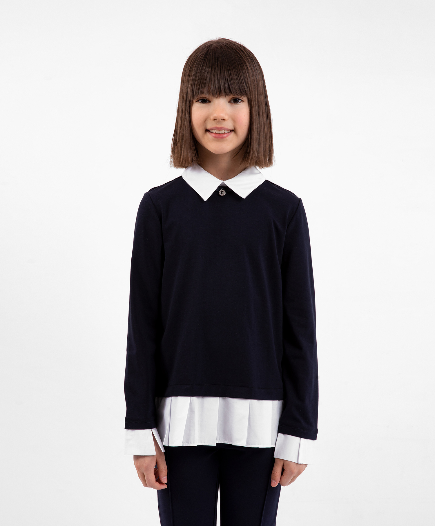 Синяя футболка с длинным рукавом имитирует комплект, состоящий из толстовки и белой блузки. Опытным путем проверено - трикотажные изделия очень комфортны для детей в школе, так как пластичны, приятны тактильно, не сковывают движений. Текстильные белые элементы: воротник, манжеты, детали низа в крупную складку делают футболку свежей, нарядной, элегантной. В оформлении изделия использован деликатный репсовый бантик с навесной металлической буквой, оформленной мелкими стразами. Футболка застегивается на потайную молнию на спинке.
