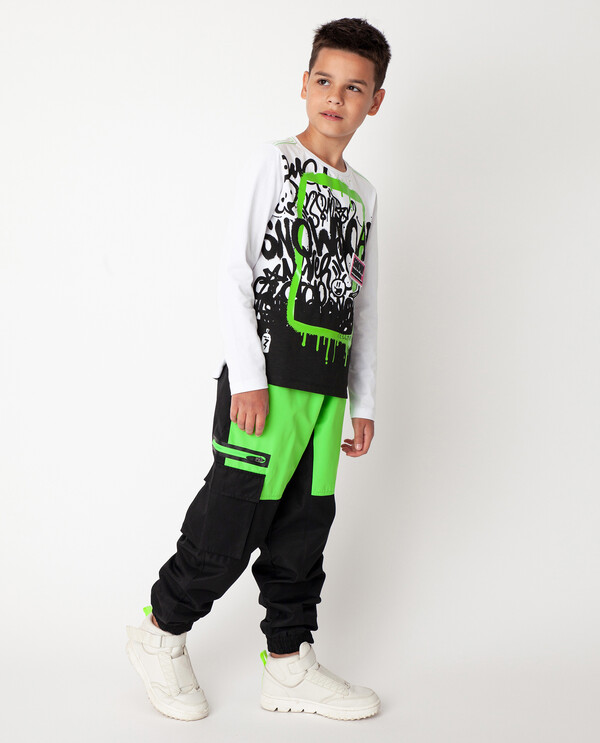 Брюки на флисе, отлично справляясь с защитой от пыли, грязи, воды, как правило, выполняют исключительно функциональную роль, не обращая на себя особенного внимания. Модель из коллекции "Лавина" разрушает стереотипы! Острый современный дизайн, построенный на контрасте двух цветов, шрифтовой принт, крупный накладной карман в коленной зоне с литой молнией, делают брюки ярким акцентом любого комплекта в спортивном стиле и позволяют сформировать множество энергичных образов подростка. Пояс и манжеты на резинке способствуют комфортной "посадке" брюк на мальчиках разного телосложения.