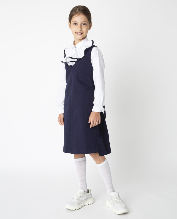 Для тех, кто предпочитает более неформальный образ, синий сарафан из вареного твила - прекрасная альтернатива классике. Сарафан выглядит очень стильно, свежо и вполне соответствует школьному дресс-коду. Благодаря варке, создающей модный эффект потертости в районе соединительных швов, сарафан имеет кэжуальные черты. Он будет отлично смотреться с любой футболкой, водолазкой, блузкой, создавая интересный школьный комплект в духе времени.