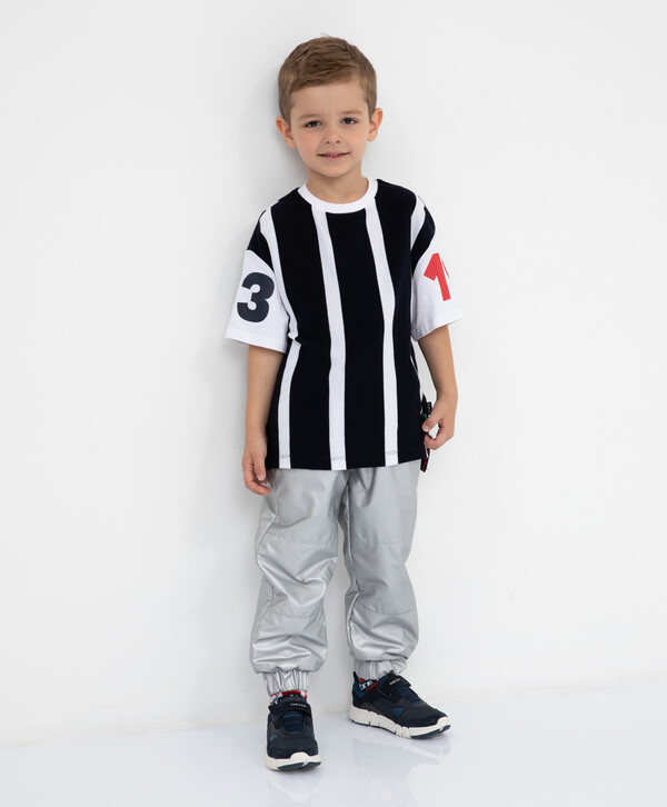 Брюки на флисе – хорошо знакомый элемент детского гардероба, но эта модель, сделанная из серебристой плащевки, разрывает существующие шаблоны! Это не просто функциональный элемент прогулочного комплекта, а яркий элемент образа, привлекающий внимание! Брюки имеют пояс и манжеты на резинке, способствующие комфорту ребенка. Дополнительная утяжка из мягкого шнура позволяет регулировать посадку изделия на мальчиках разного телосложения.