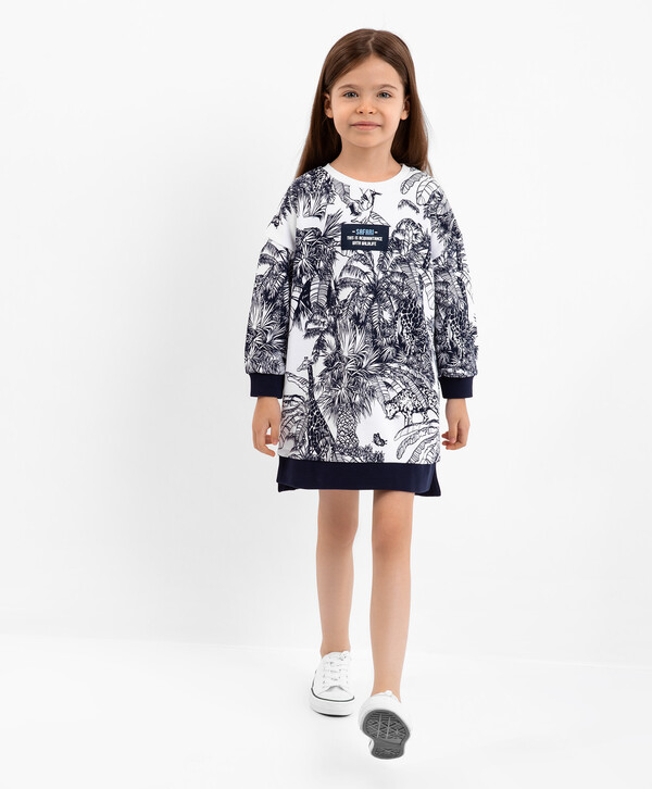 Платье из футера свободной объемной формы - must have гардероба девочки! В отличие от однотонных моделей, платье с интересным рисунком, выполненным в стиле "Туаль де Жуи", выглядит небанально, самобытно, свежо. Легкая воздушная линеарная графика принта красиво сочетается с контрастными однотонными элементами: трикотажными подвязами на рукавах и по низу изделия, а также с жаккардовой нашивкой с шрифтовыми элементами. Темные детали подчеркивают красоту и утонченность рисунка, делают платье цельным и завершенным.