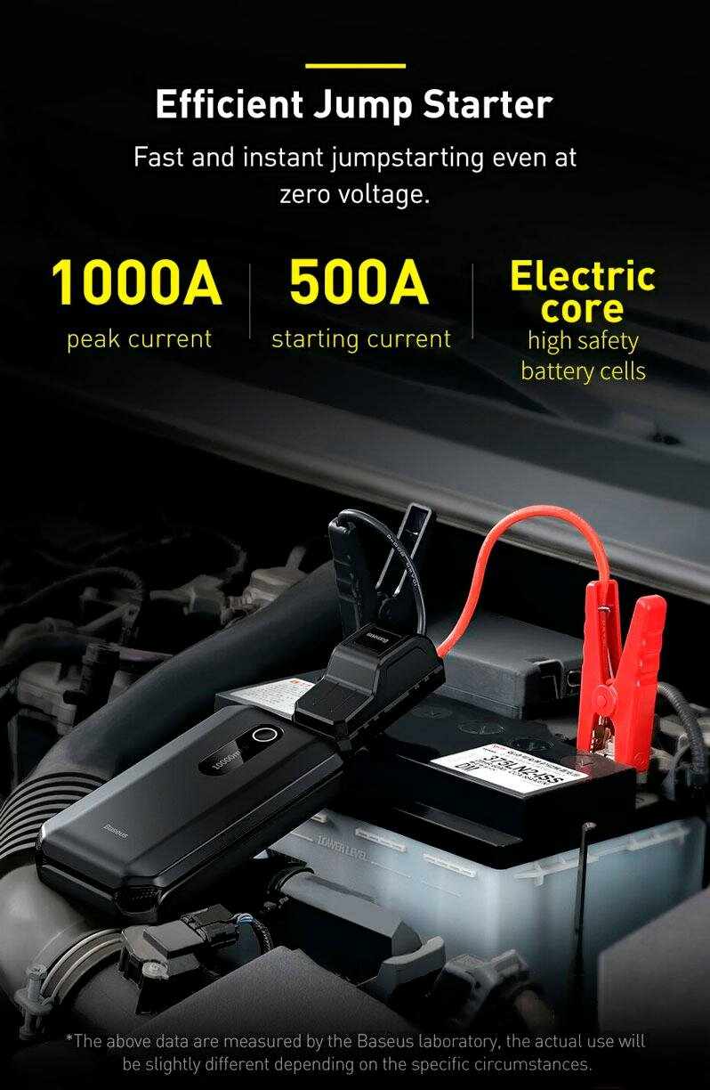 Неожиданно разряженный аккумулятор в вашем автомобиле больше не будет мешать вашим планам. Пуско-зарядное устройство Baseus поможет вам завести свой автомобиль! Он отличается широкой совместимостью и емкостью 10 000 мАч, что позволяет использовать его до 40 раз на одной зарядке. Устройство также будет работать как фонарик и powerbank - оно оснащено портами USB и USB-C. Он также прост в использовании и обеспечивает безопасность использования.