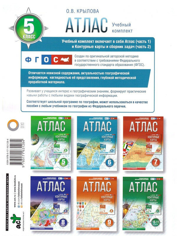 Атлас по географии для 5-го класса (автор – О.В. Крылова) имеет главную цель - привить учащимся интерес к географическим знаниям. Содержание атласа направлено на усвоение учащимися основ знаний о Вселенной и планете Земля, а также на формирование у них первоначальных картографических умений: определять стороны горизонта и взаиморасположение географических объектов, составлять элементарные географические описания, сравнивать и классифицировать. Созданный по оригинальной авторской методике в соответствии с "Концепцией развития географического образования в Российской Федерации", атлас характеризуется новизной содержания, универсальностью, нацеленностью на развитие творческого начала у школьников. Атлас соответствует требованиям ФГОС и одобрен методистами. Россия в атласе представлена в новых границах: с Донецкой и Луганской народными республиками, Запорожской и Херсонской областями, Республикой Крым и Севастополем.