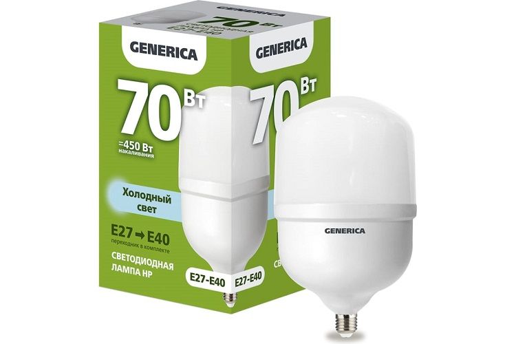 Лампа с цоколем E27/E40 обладает мощностью в 70 Вт. Цветовая температура – 6500 К. Использовать ее можно для основного или локального освещения в помещении. Так, лампу GENERICA применяют для светильников, ночников, настольных ламп и люстр. Также она подходит для декорирования отдельных зон или создания световых эффектов. Продуманная конструкция и качественные материалы обеспечивают равномерное распределение света и высокий световой поток, при этом лампа практически не нагревается во время работы. Лампочка работает без пульсации и мерцания. Частые включения и выключения, как и перепады напряжения, не влияют на срок службы прибора. Безопасность, большой срок службы и низкое энергопотребление — главные преимущества лампочек GENERICA.